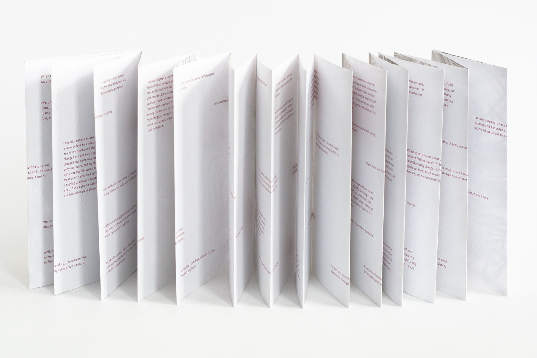 The text fragments are excerpts from interviews conducted in collaboration with linguists. In the long leporello book, the thoughts and experiences of nine individuals sharing the same name converge and intermingle.